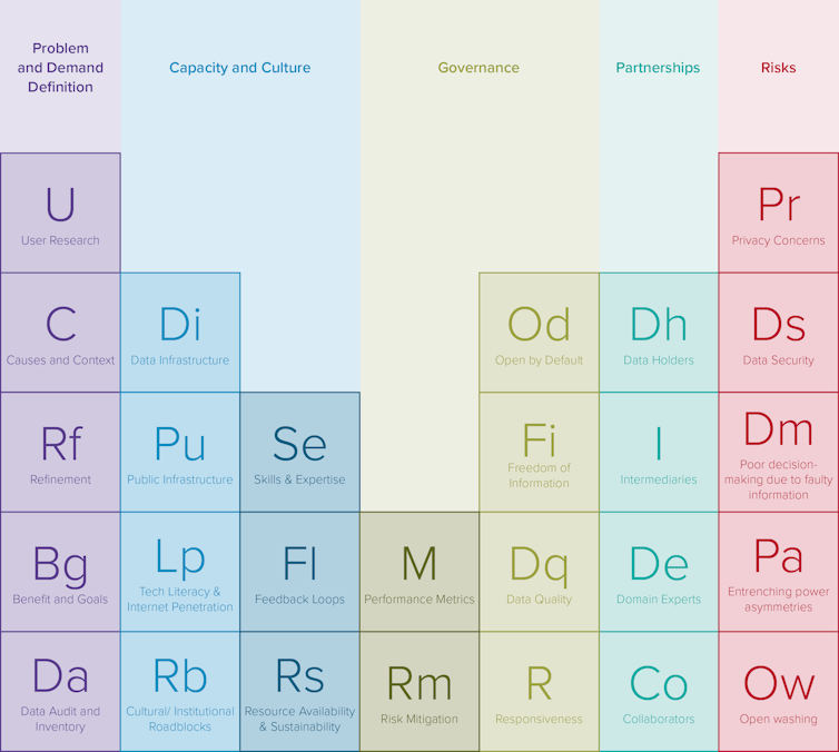 5. The ingredients matter To better understand why some open data projects fail while others succeed, we created a “periodic table” of open data (below), which includes 27 enabling factors divided into five broad categories.