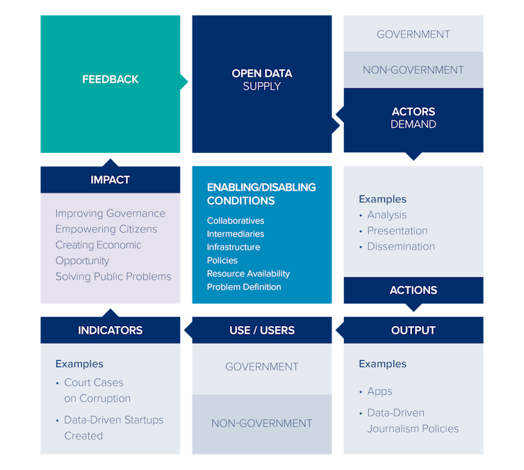 To that end, the GovLab has created an evidence-based framework that aims to better capture the role of open data in developing countries. The Open Data Logic Framework below focuses on various points in the open data value cycle, from data supply to demand, use and impact.